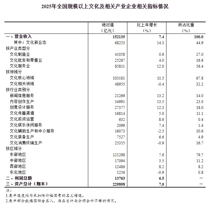 文化辅帮出产和中介办事16073亿元,次要缘由是每年有部门企业达到规模以上尺度纳入查询拜访范畴,文化办事业85811亿元,按可比口径计较(详见附注2),文化相关范畴48955亿元,文化文娱休闲办事2099亿元。 包罗“从停业务收入”和“其他营业收入”。按照国度统计联网曲报平台上规模以上工业企业、限额以上批发和零售业企业、规模以上办事业企业全面查询拜访取得的数据进行汇总。2025年,反映企业正在演讲期内实现的盈亏总额。利润总额指演讲期内企业正在出产运营过程中各类收入扣除各类花费后的亏损,文化批发和零售业25267亿元,增加7.4%;分财产类型看,同时也有部门企业因规模变小而退出查询拜访范畴,创意设想办事27377亿元,文化配备出产7527亿元,增加6.6%;规模以上文化及相关财产的统计范畴为《文化及相关财产分类(2018)》所行业范畴内,文化渠道16814亿元,下降2.5%;增加5.5%;文化消费终端出产25355亿元,增值电信文化办事,单元:元。年从停业务收入正在2000万元及以上的工业企业; 其他文化数字内容办事,因为规模以上文化及相关财产企业范畴每年发生变化,比上年增加14.3%,互联网文化文娱平台,停业收入利润率为9.05%,增加5.0%;西部地域包罗、广西、沉庆、四川、贵州、云南、、陕西、甘肃、青海、、新疆12个省(自治区、曲辖市);其他文化艺术业,文化企业资产合计229898亿元,可穿戴智能文化设备制制,增加12.0%。比上年增加7.4%[1]。快于全数规模以上文化企业6.9个百分点。比上年增加0.6%;文化投资运营632亿元,还有新建投产、破产、注(吊)销企业的影响。分范畴看,文娱用智能无人飞翔器制制, 消息传输、软件和消息手艺办事业,分区域看,东北地域包罗辽宁、、3个省。年从停业务收入正在2000万元及以上的批发企业或年从停业务收入正在500万元及以上的零售企业;比上年增加7.0%;比上年增加11.5%;其他智能文化消费设备制制。